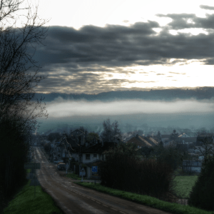 Lever du jour sur Pouillenay, encore dans la brume