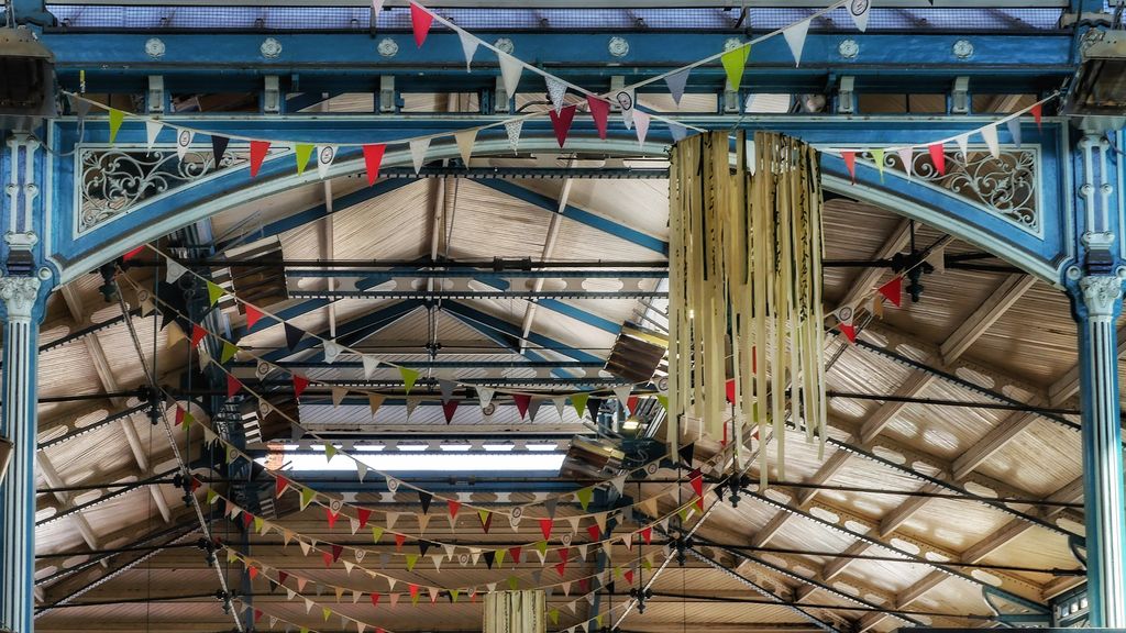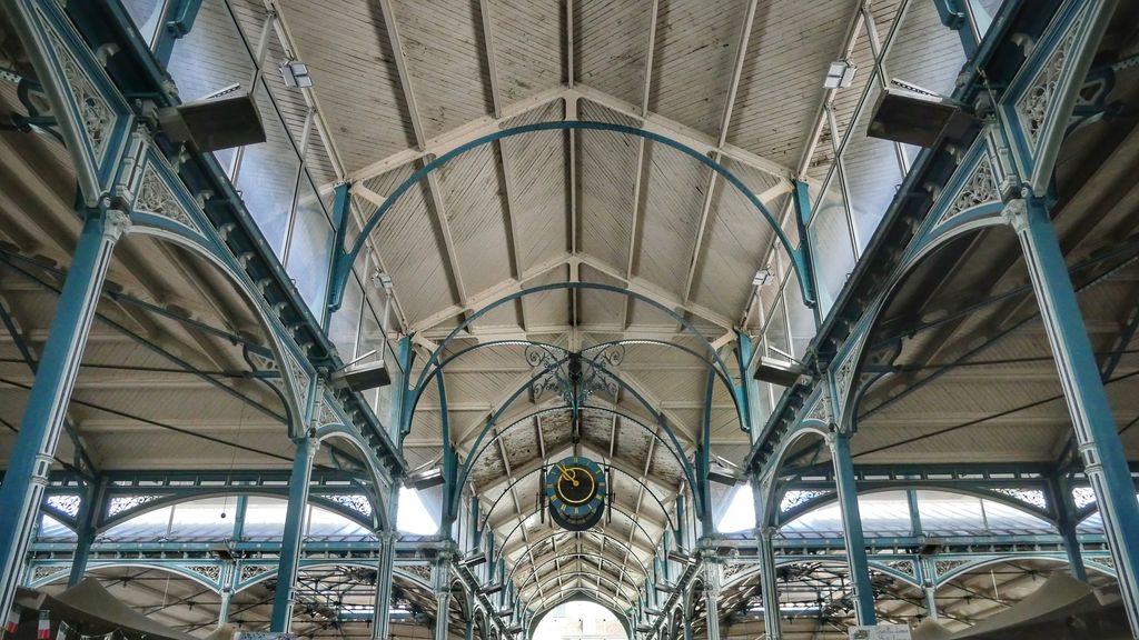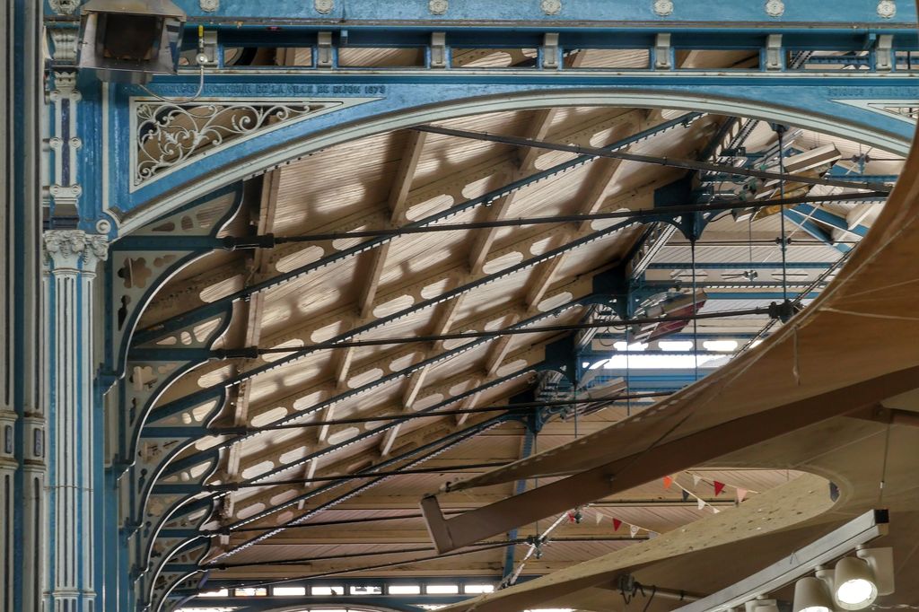 - lorsqu’elles sont vides de toutes activités, pour apprécier la splendeur des lieux: Un espace lumineux, qui surprend avec ses grandes arches, sur lesquelles on retrouve des motifs animaliers, l’enfilade d’arcades et de colonnes aux chapiteaux décorés. La toiture rappelle celle des halles de Paris.