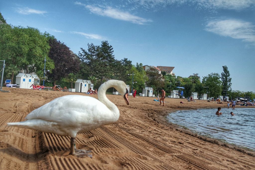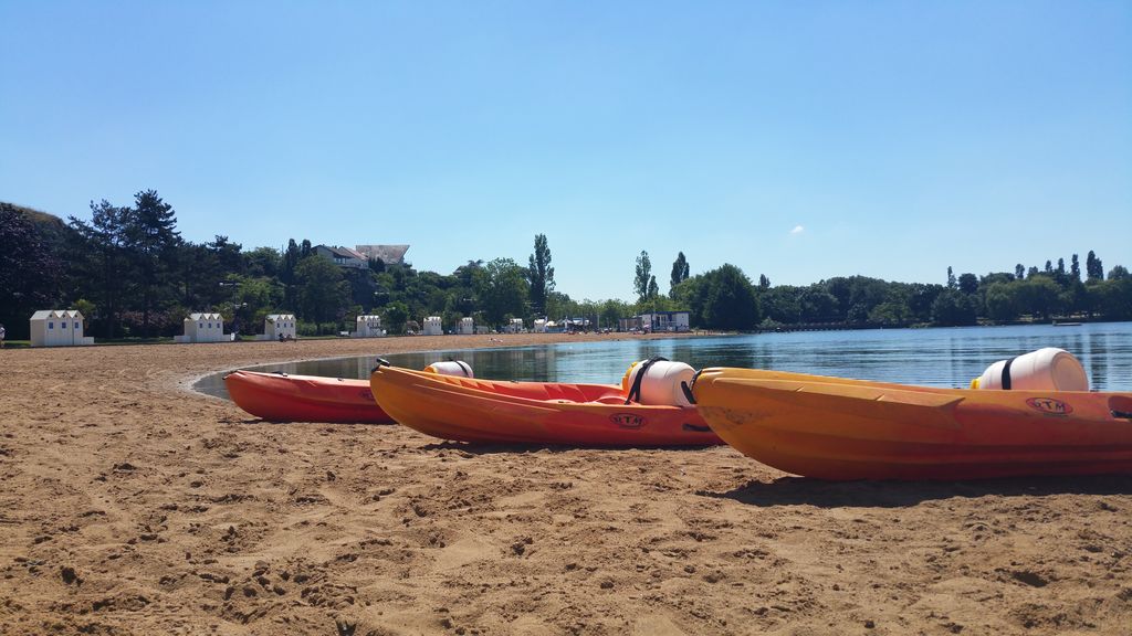 En été, une partie du lac se transforme: baignade surveillée, pontons, plage aménagée, cabines, douche de plein air, location de parasols, transats, palmiers pour une touche d’exotisme, bar- snack et de nombreuses animations.
