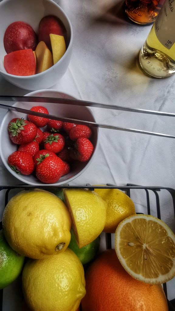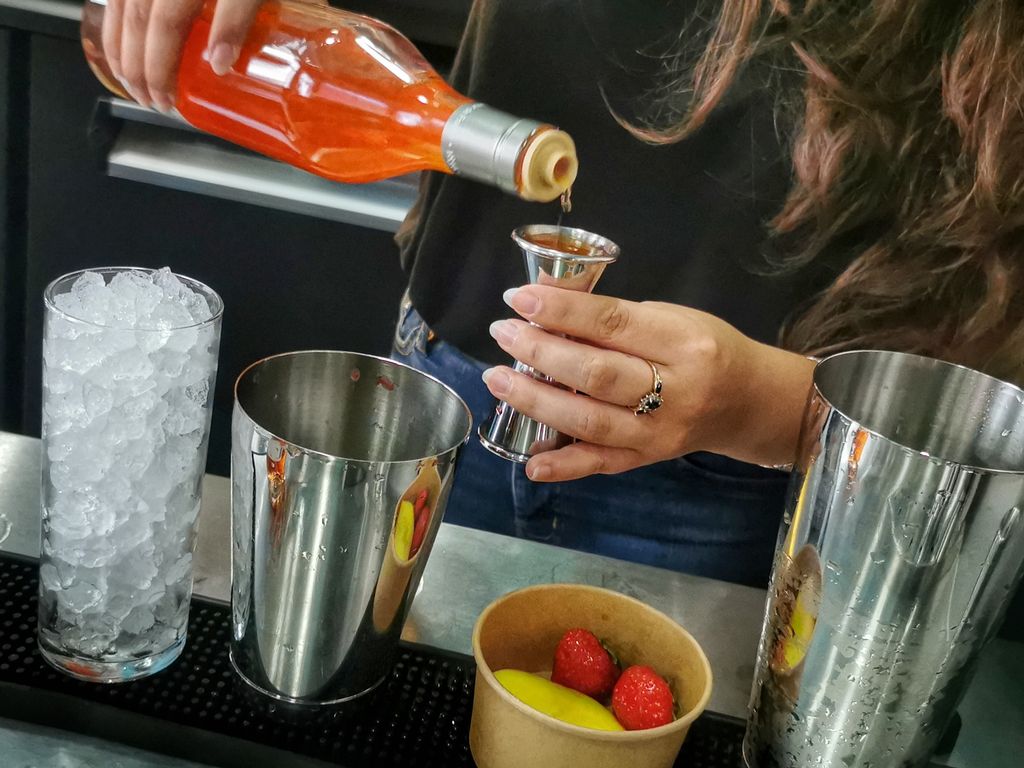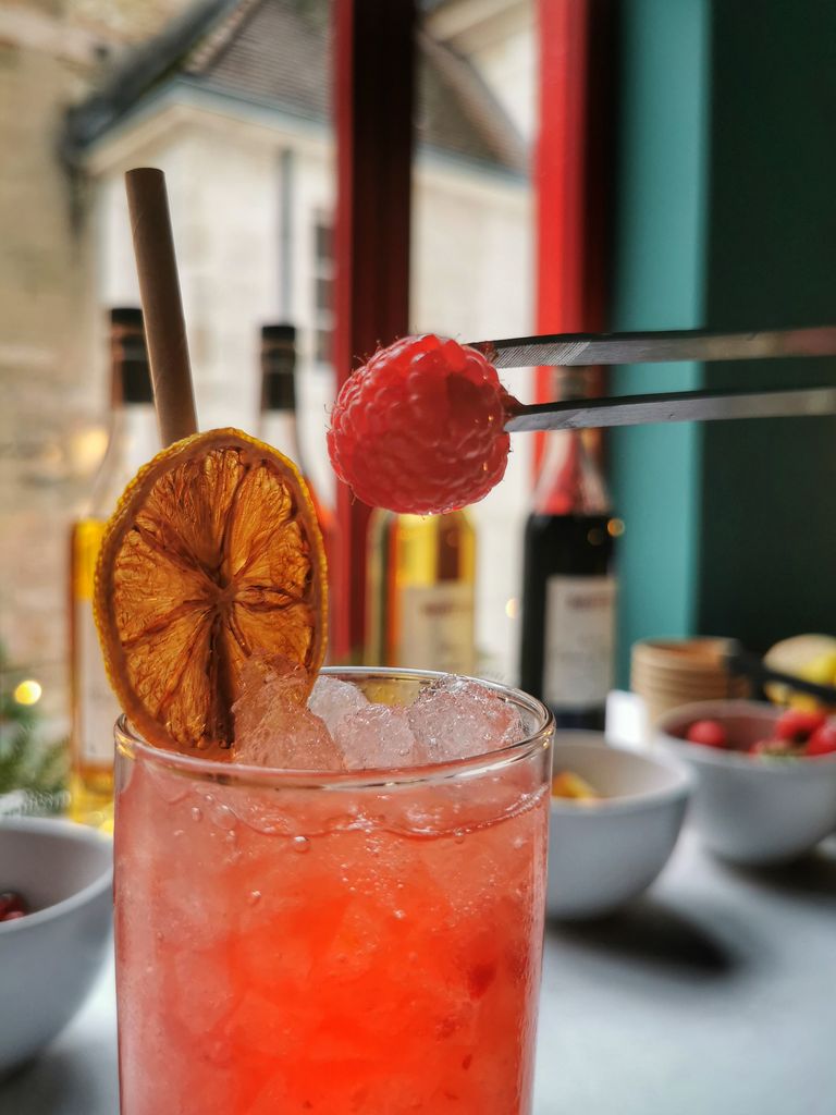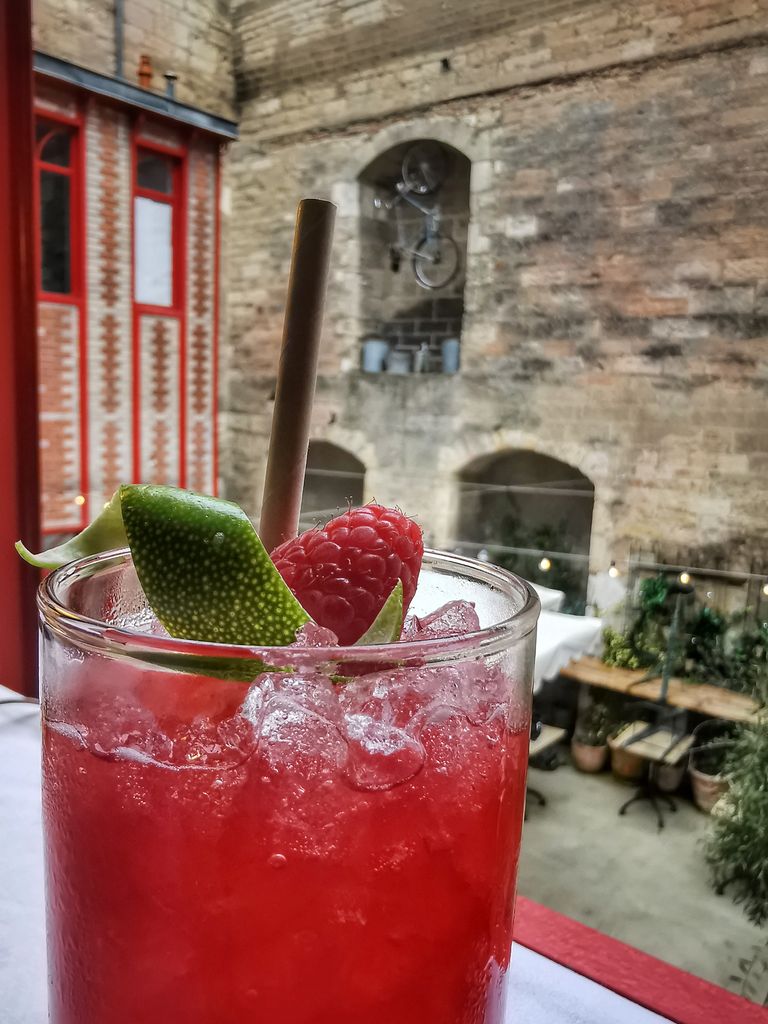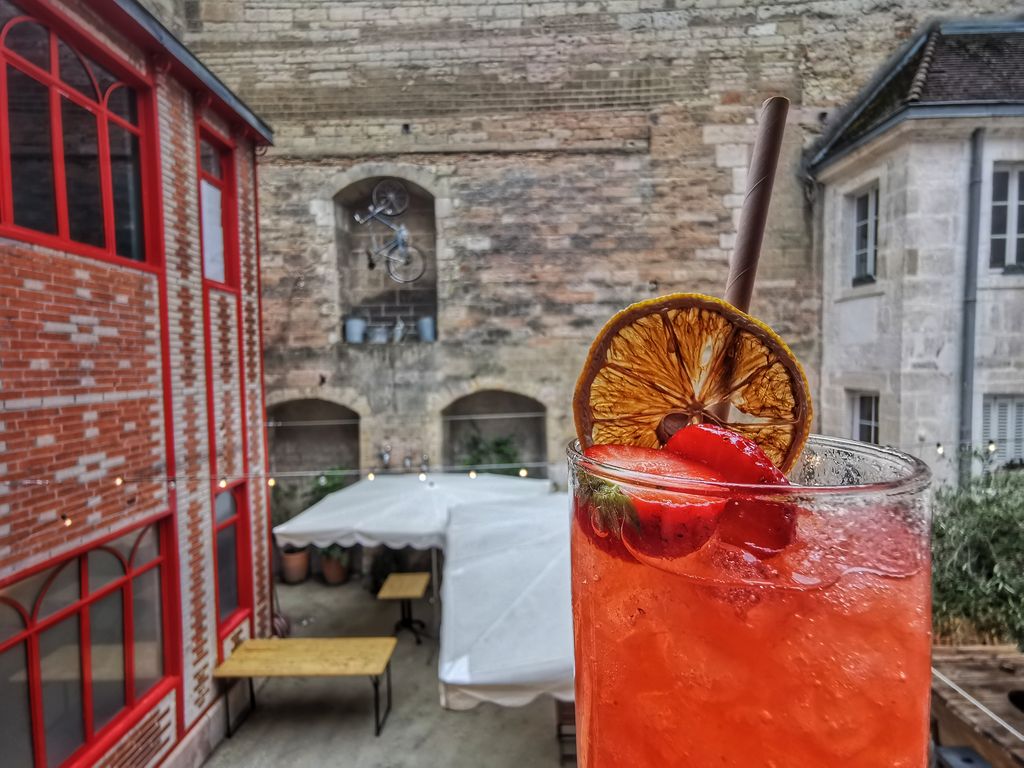 Après la théorie, la mise en pratique: il est temps de passer aux commandes et de réaliser SON cocktail! Colin remet à chacun le matériel nécessaire et c’est parti pour le choix des produits: glace pilée, shaker, fruits frais, liqueurs, sirop, bitter…. Telle une apprentie sorcière, je concocte ma potion: je prépare ma glace, écrase mes fraises, 4cl de ratafia de Bourgogne Briottet par ici, 2 autres centilitres de mangue par là, deux-trois gouttes de bitter, un p’ti coup de shaker, touche finale décorative et y’a plus qu’à déguster tout en profitant du lieu !
