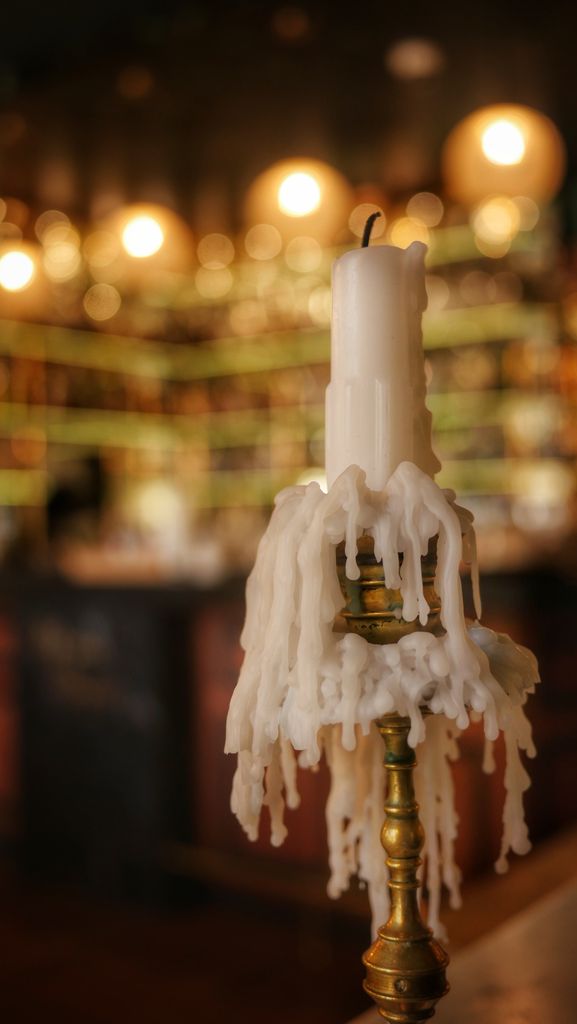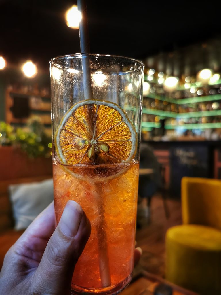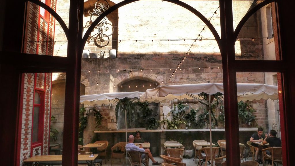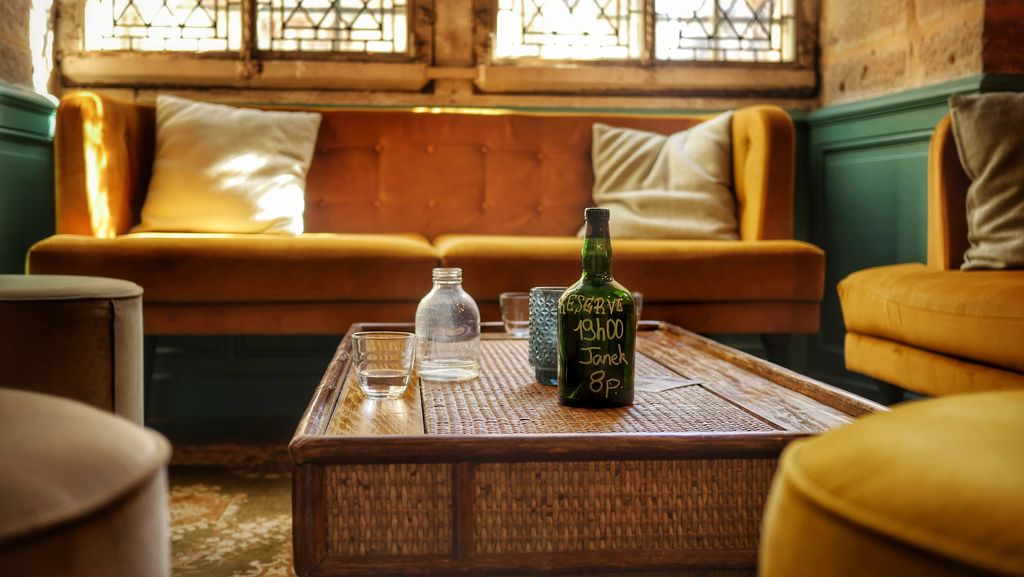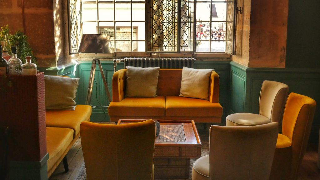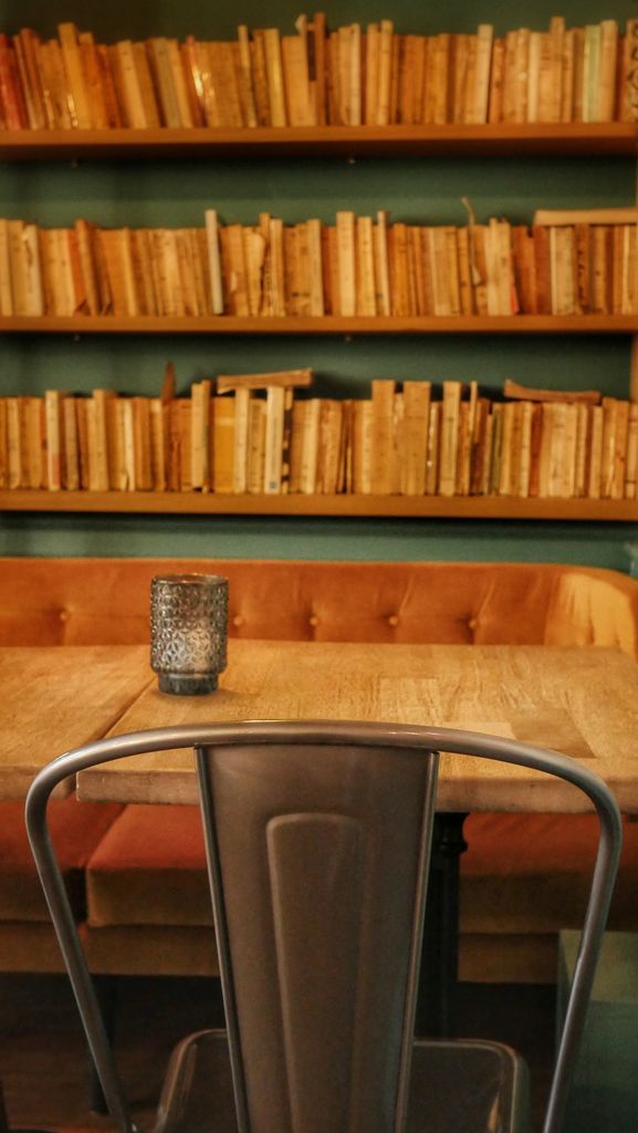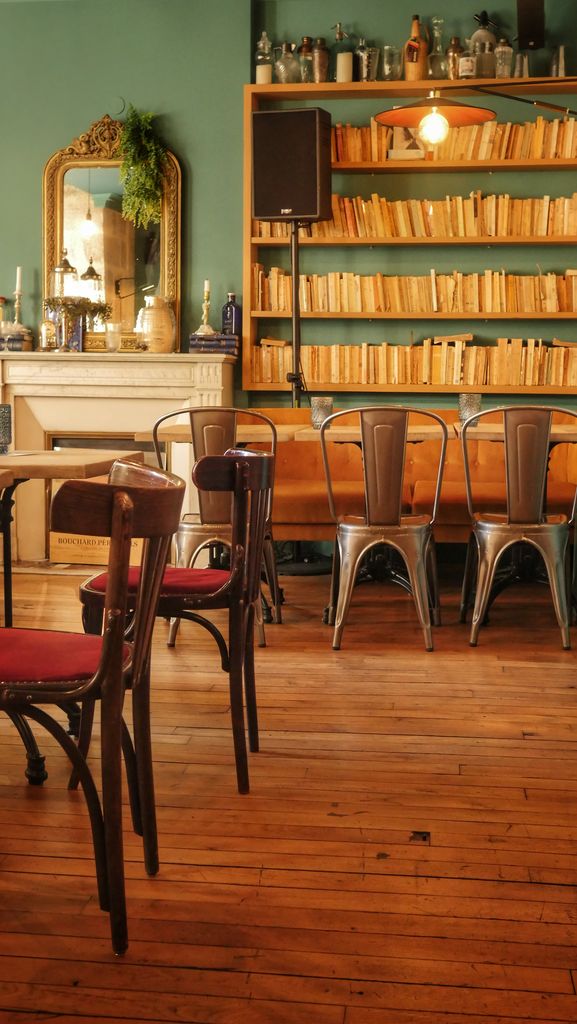 C’est avec élégance que ce lieu mêle différentes ambiances: Cosy, dans les deux salles principales du bar, murs bleu canard, grands canapés jaune moutarde, bibliothèques, candélabres… Ambiance chineur avec les piles de livres anciens, pianos où siègent divers ustensiles vintages, ambiance intimiste avec des espaces en retrait , ambiance guinguette avec la vaste cour intérieure arborant briques, plantes et guirlandes lumineuses.