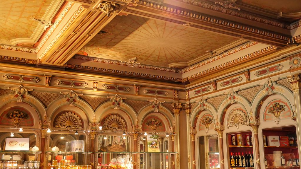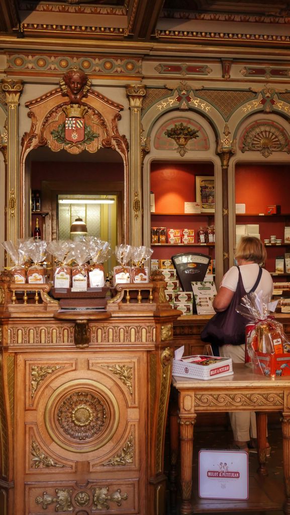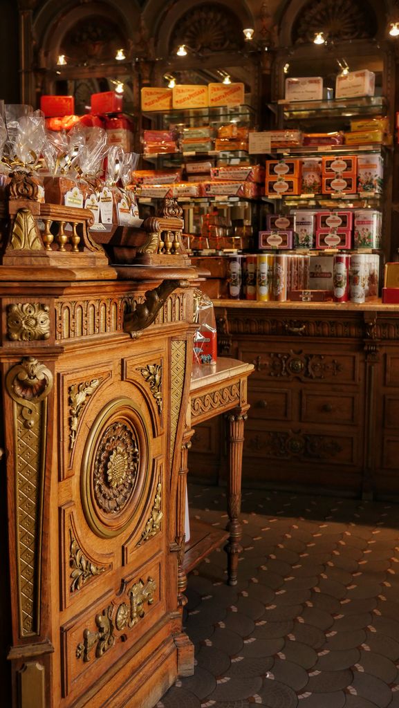 Ce lieu est épatant, les plafonds et les boiseries sont somptueusement décorés et attirent immédiatement le regard, le vieux comptoir en bois et l’ancienne balance nous font faire un bond dans le temps. On raconte que lors de la restauration de la façade du bâtiment en 1919, dans le style néogothique, un mulot s’est glissé parmi les petits animaux sculptés, soyez attentifs!